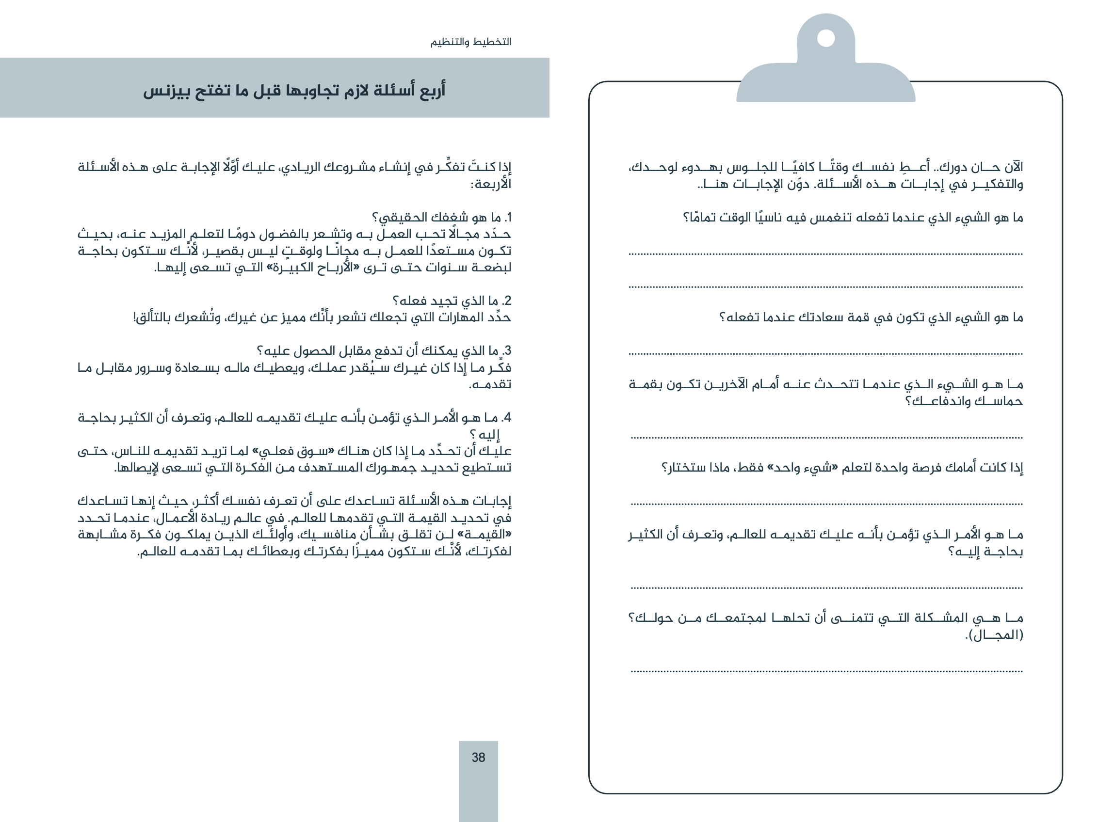 - كيف تُدوِّن أفكارك وتقيمها وفق اختبارات شخصية وتمارين عملية.